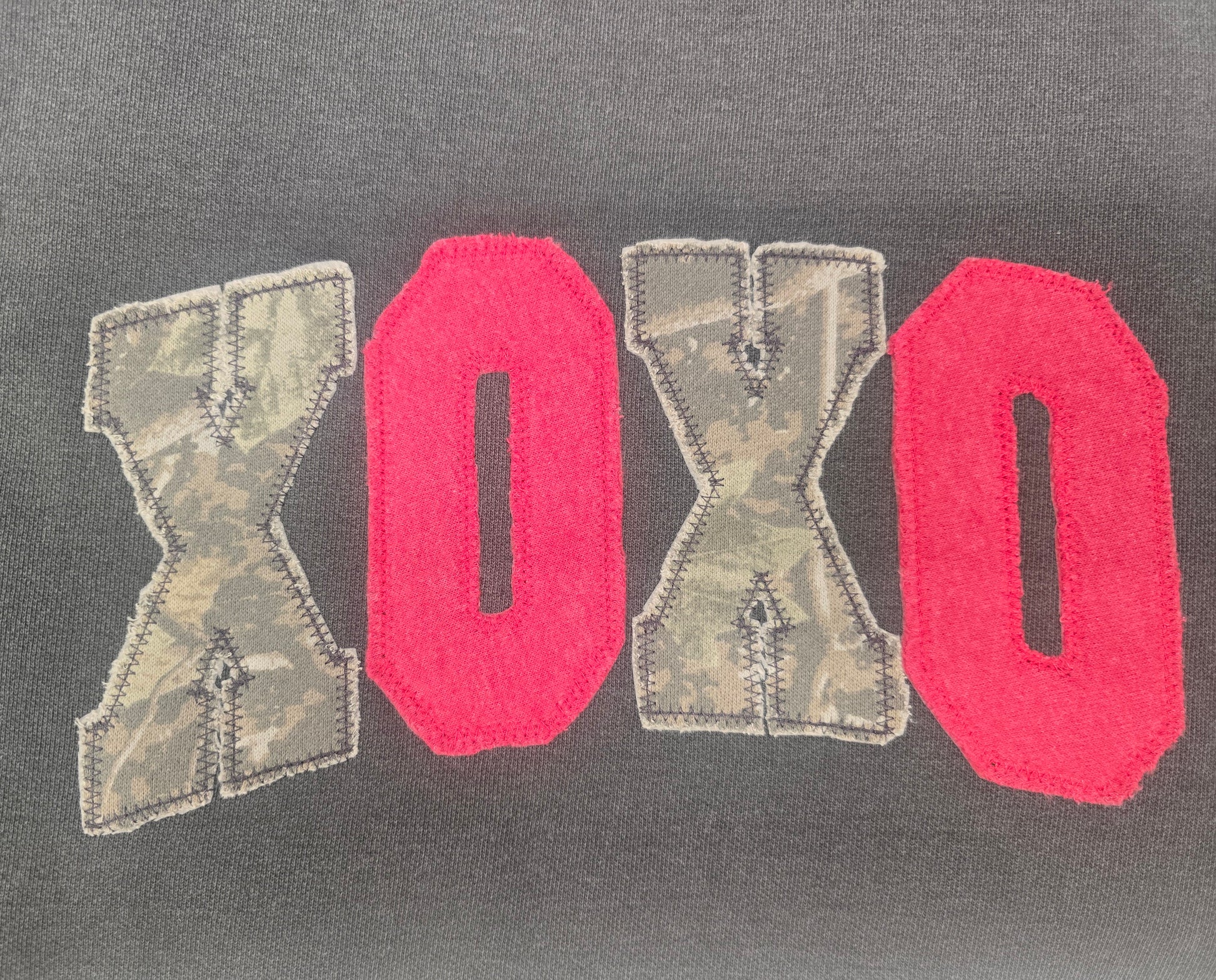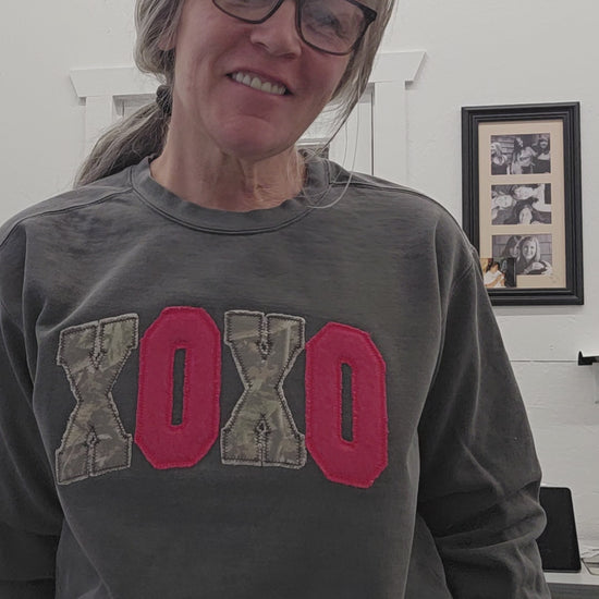 Applique raggy camo and red for that lived in look on a pepper comfort color Crew.